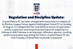 公告内容:“水晶宫足球俱乐部因8月24日对阵诺丁汉森林足球俱乐部的英超联赛中存在不当行为而受到指控,该俱乐部未能确保其观众及/或支持者(以及任何自称支持者或追随者的人员)在比赛期间避免采取不当、冒犯性、辱骂性、侮辱性及/或挑衅性行为。”