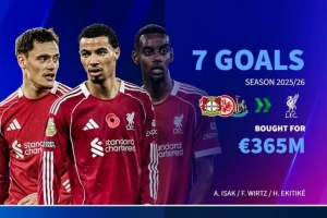 利物浦在今夏共计花费3.65亿欧元基础转会费引进了维尔茨(勒沃库森)、埃基蒂克(法兰克福)、伊萨克(纽卡斯尔),3人至今共计贡献7球5助攻。