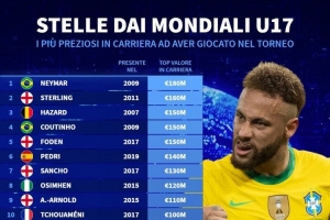 体育资讯11月15日讯 德转列出了曾参加U17世界杯球员最高身价排名,内马尔1.8亿欧居首,斯特林1.6亿欧次席。