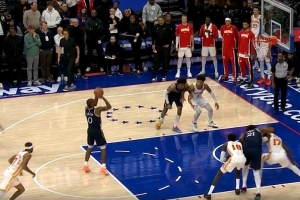 没收住!哈珀防守布伦森被认定垫脚 吹一级恶意犯规