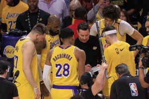 杨毅:湖人这个队,东契奇、里夫斯、老詹,你三位一位都防不了,是吧?球队三个头牌一位都防不了,那你怎么防?是不是那么再加上这个首发里边还有八村塁来说,就是他有他的特长,他能顶一下,但是你真正让他换到外边防一二号位,他也防不了,这四个人都防不了突破。