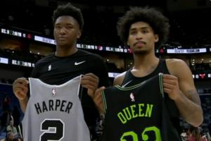此役,鹈鹕13号秀奎因得到33分10篮板10助攻4盖帽,正负值+14。马刺榜眼哈珀拿到22分3篮板6助攻,正负值+3。