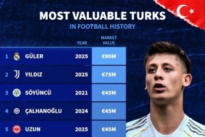 体育资讯12月14日讯 德国转会市场列出了土耳其球员历史身价排名,居莱尔9000万欧居首,伊尔迪兹7500万欧次席。