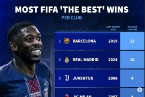 体育资讯12月17日讯 FIFA年度颁奖典礼结束,登贝莱获FIFA年度最佳球员,德转列各俱乐部球员获FIFA年度最佳球员次数,巴萨12次居首,皇马10次第二,尤文、米兰、国米、巴黎4次并列第三。