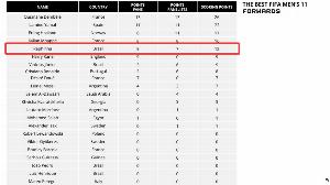 在国际足联公布的最佳阵前锋位置评分中,拉菲尼亚排名第五,其中球迷评分5分、专家评分7分,总得分12分,落后于登贝莱(26分)、亚马尔(22分)、哈兰德(17分)、姆巴佩(16分)。