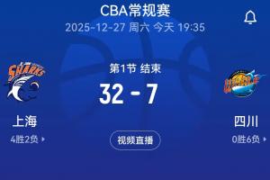 体育资讯12月27日讯 CBA常规赛第7轮,四川首节7-32落后上海。