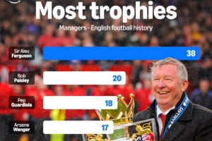 流媒体平台“Prime Video”列举出了执教英超球队夺冠数top8的主教练,弗格森爵士38冠遥遥领先,温格、瓜迪奥拉和穆里尼奥在榜。具体如下: