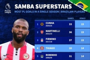 体育资讯1月5日讯 布伦特福德在本轮英超4-2击败埃弗顿,伊戈尔·蒂亚戈戴帽。数据统计显示他距离英超单赛季巴西射手王仅一步之遥。