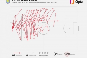 据Opta统计,林德洛夫本场比赛传球85次,成功率100%。2022年2月26日拉波尔特(110次传球全部成功)之后,林德洛夫是英超单场传球次数最多且成功率100%的球员。