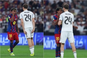 巴萨在西超杯决赛3-2击败皇马夺冠,这场比赛并非只有温情,比赛过程中也多次爆发了紧张的对峙。其中一次冲突的主角是西班牙国家队的两位队友:亚马尔与赫伊森。