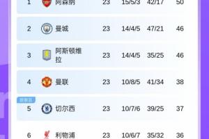 目前英超积分榜上,前六为阿森纳、曼城、维拉、曼联、切尔西、利物浦。