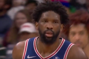 GIF-恩比德反击上篮被罗林斯干扰,裁判吹犯规,雄鹿挑战成功,取消犯规