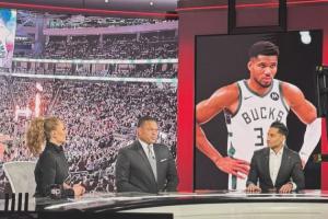 Shams晒出了自己当地时间接近深夜12点还在做节目的照片,节目中Shams在讨论的是字母哥的相关动态。