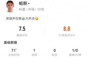 体育资讯2月19日讯 科莫在本轮意甲1-1暂时战平米兰,帕斯本场数据如下: