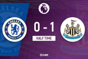 上半场伤停补时4分钟,半场结束,切尔西暂0-1纽卡斯尔。
