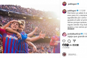 加维社媒晒出与阿尔巴的合照,并写道:“兄弟,你已经知道你对我来说有多么特别,在我升入一线队的时候,你的欢迎和引导让我永远心怀感激。”